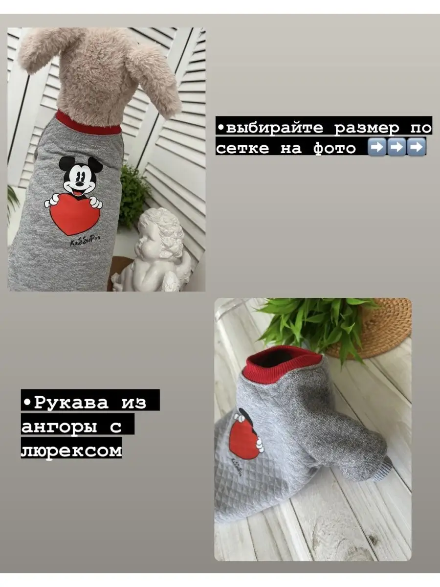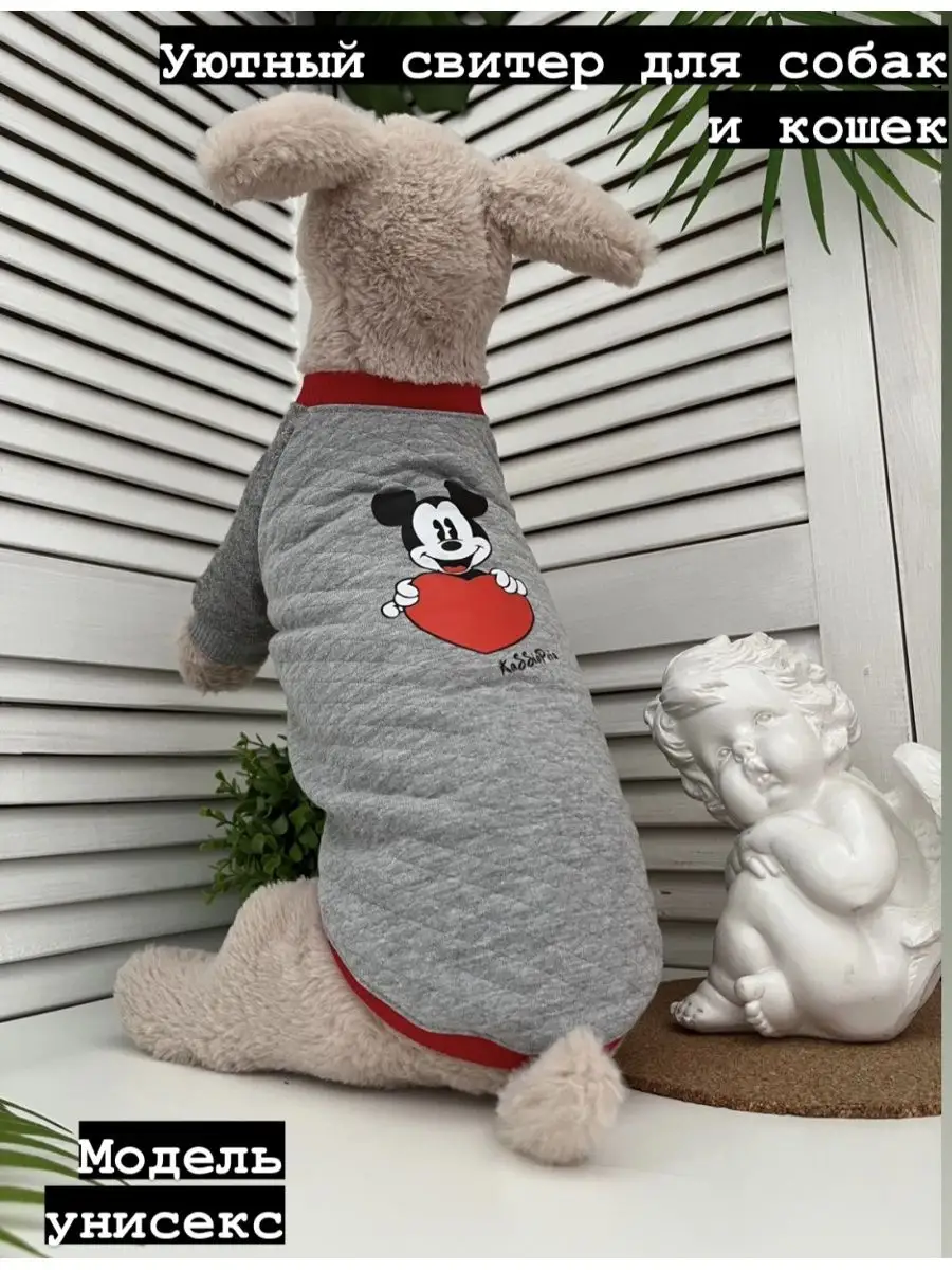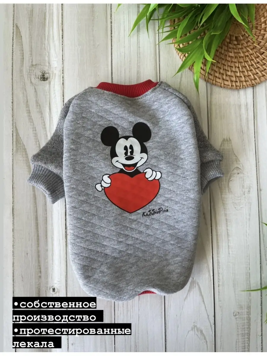 Трикотажный свитшот для собак и кошек, мелких и средних пород, выполнен из мягкого и приятного капитония, ткань одновременно теплая и уютная, рукавчики из тепленькой ангорки, на спинке термотрансфер с миккимаусом и сердечком. Комфортный крой не сковывает движения и не станет помехой для радостных игр, материал капитоний, мягкий и приятный для любой шерсти и кожи, не вызывает аллергии и помогает сохранять тепло. По горловине, рукавам и низу толстовки трикотажные манжеты, облегающие тело собачки. Рекомендуем стирать свитер при температуре не выше 30гр. Размерный ряд от XS, даже самые маленькие собачки и кошечки найдут себе подходящую толстовку по размеру. Выбирая одежду для животных Важно учитывать объем шеи, груди и длину спинки и выбирать размер согласно размерной сетке, которая выложена на последнем фото. Товары для животных отшиваются максимально учитывая строение тела животного и их потребность в натуральности тканей, поэтому все модели отшиты из высококачественного хлопка и по протестированным лекалам. Защитит ваших любимцев, когда на улице начинает холодать! Защитит от холодного ветра и влажности шерсть вашего любимца! Подойдет для носки весной, осенью и зимой, как первый теплый слой под комбинезон или жилетку. Удобно надевается, без застежек. Подойдет и для мальчиков, и для девочек. Рекомендации по уходу костюма для животных: стирка отдельно от других вещей при температуре 30 градусов. Не рекомендуется отбеливать.