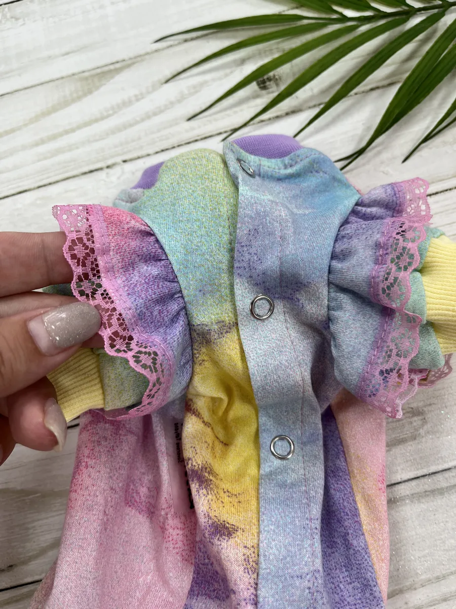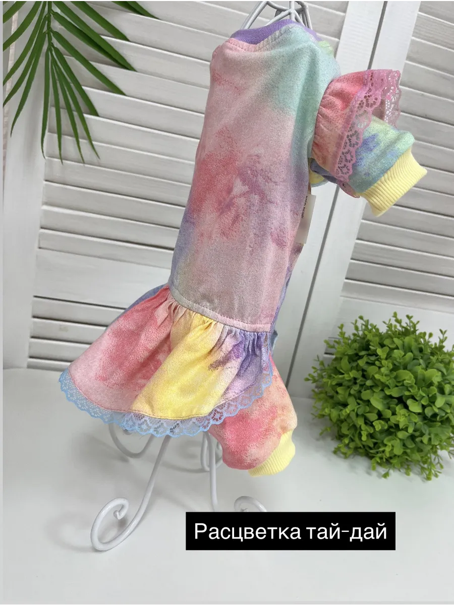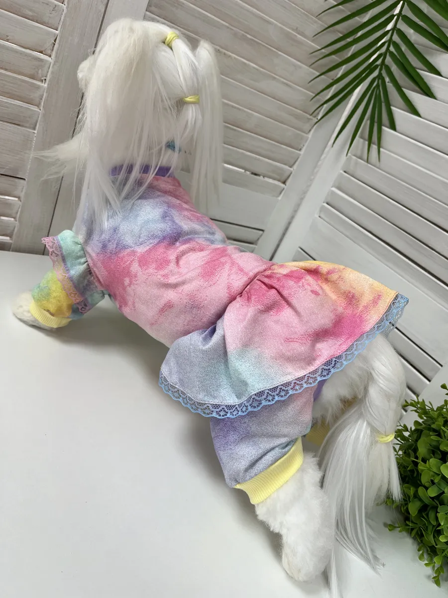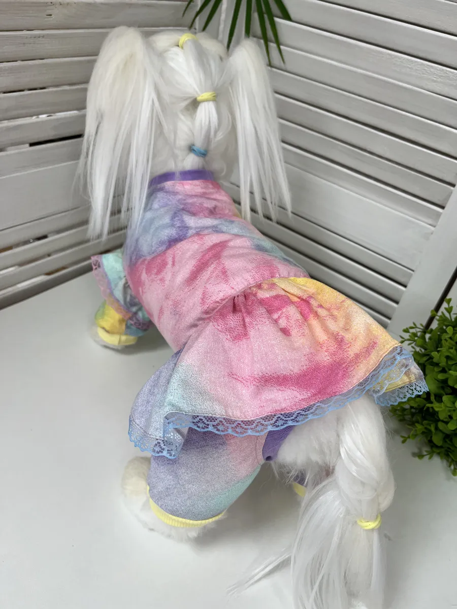 Удобный трикотажный комбинезон для Ваших хвостатых друзей, можно носить как пыльник, как пижамку, как первый слой под теплый комбинезон или жилет. Такой комбинезон станет незаминим для приучения собачки к одежде, в то время когда еще нельзя гулять или в холодное/прохладное время, поможет защитить Вашего питомца от переохлаждения. Комбинезон с закрытым животиком подойдет для девочек. Ткань кулирка 100% хлопок, по низу на передних и задних лапках трикотажный подвяз, по талии резинка для более комфортной посадки по фигуре, на рукавах симпатичные рюшки с кружевом, на талии юбка, застежка на металлические кнопки на животике. Комбинезон раскроен по протестированным лекалам и максимально повторяет строение тела животного, гиппоаллергенный натуральный материал не вызовет раздражения даже на самой чувствительной коже, подойдет для любого вида шерсти. При выборе размера обязательно ориентируйтесь на размерную сетку представленную в галерее товара. Наши комбинезоны прекрасно подходят всем собачкам мелких и средних пород, таким как йорки, мальтезе, той-терьеры, бишон-фризе, чухуа-хуа, джек рассел терьеры, карликовые пудели и другим породам, подходящим по параметрам в размерной сетке. Так же подходят кошкам всех пород, особенно сфинксам. Комбинезон пыльник защитит от грязи, пыли, клещей и веточек, репьев и т.д. Рекомендации по уходу за костюмом для животных – стирка при 30 градусах, не отбеливать, не отжимать.